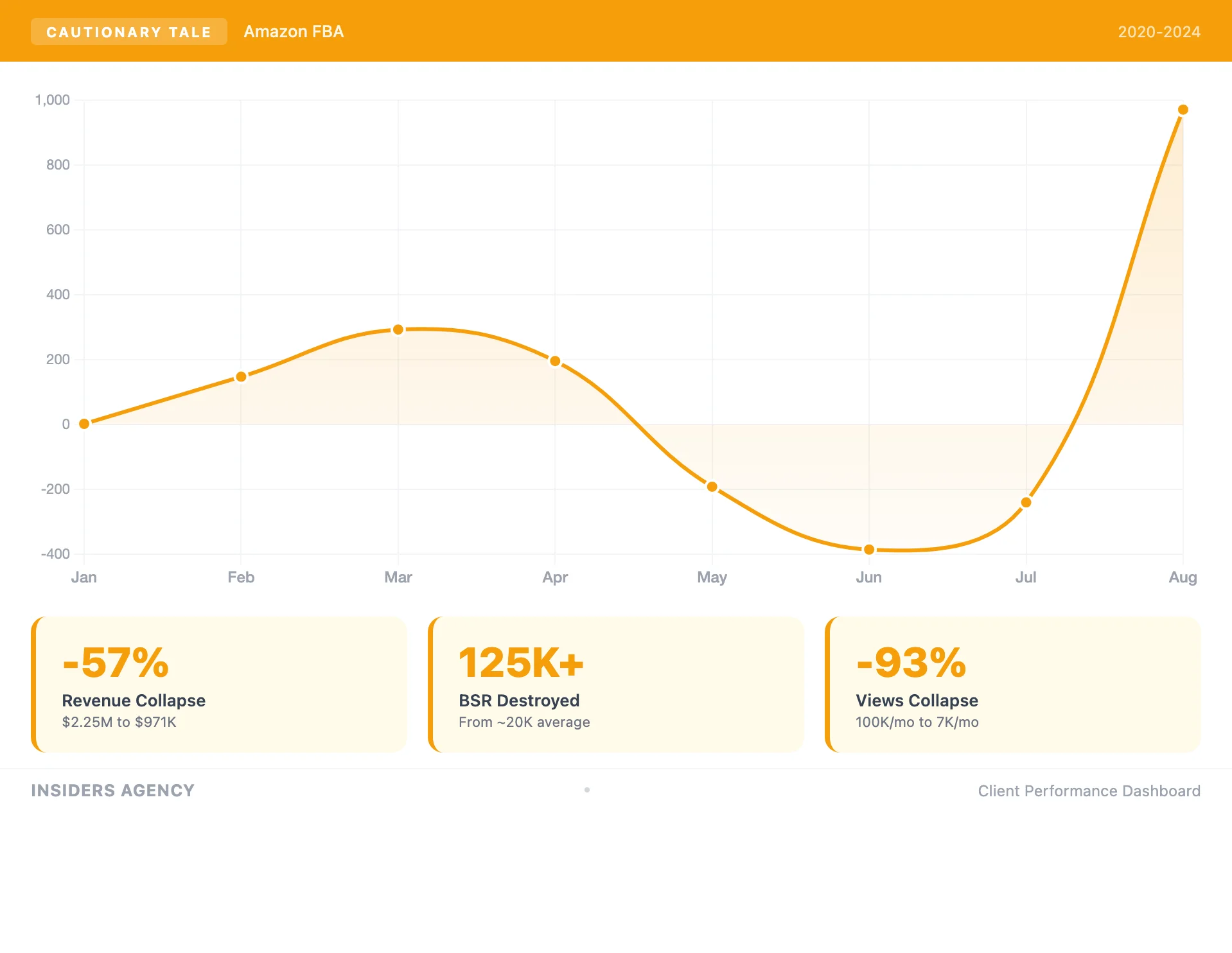 Revenue from $2.25M to $971K. BSR from 20K to 125K+. Views from 100K/mo to 7K. The new owner replaced a $5K/month team with <$1K software. The savings cost them everything.