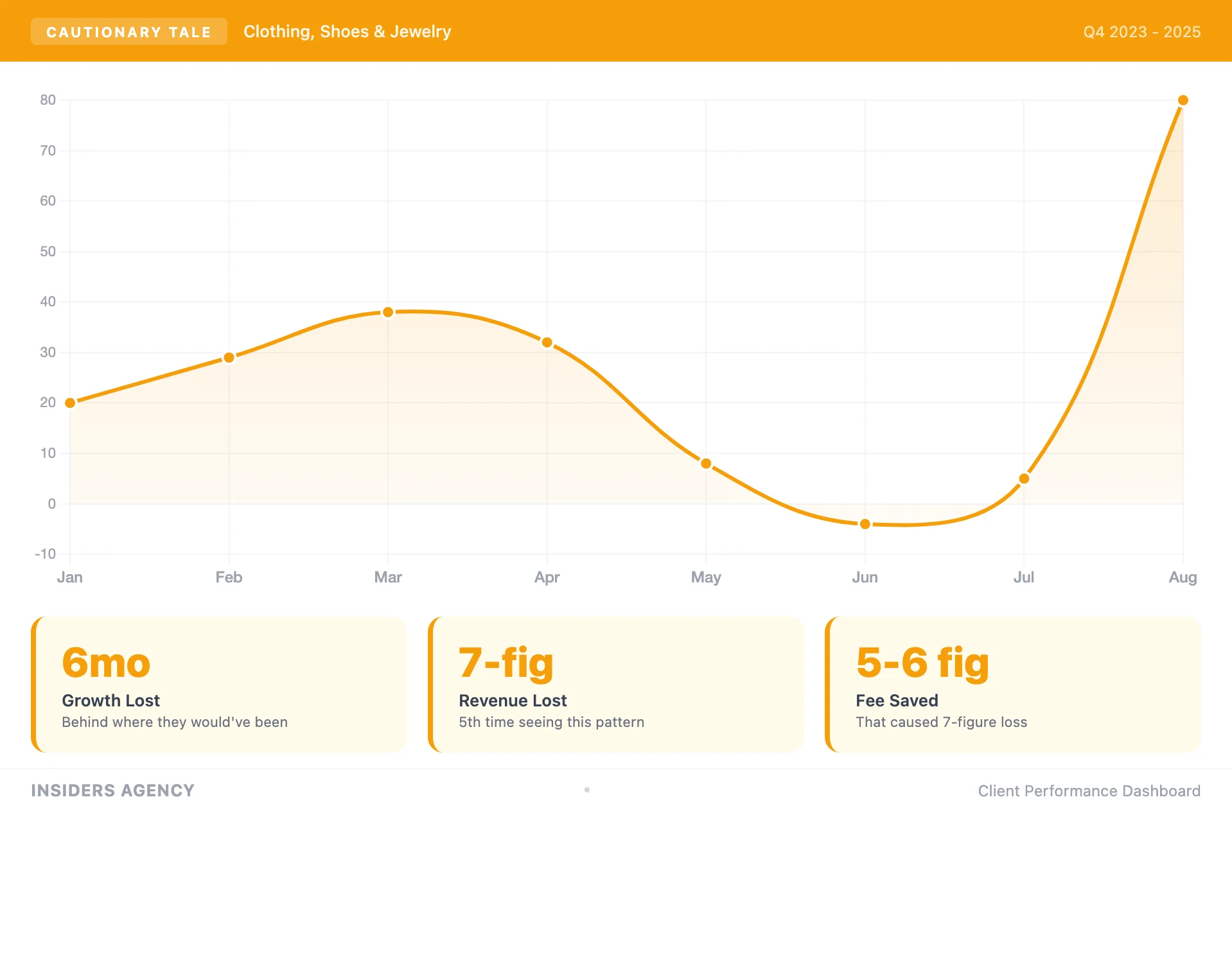 Clothing, Shoes & Jewelry brand onboarded Q4 of the prior year. Steady growth under our management. Client decided they were 'paying us too much' and left. Sales plummeted within 6 months. They came back. Now they're 6 months behind where they would have been.