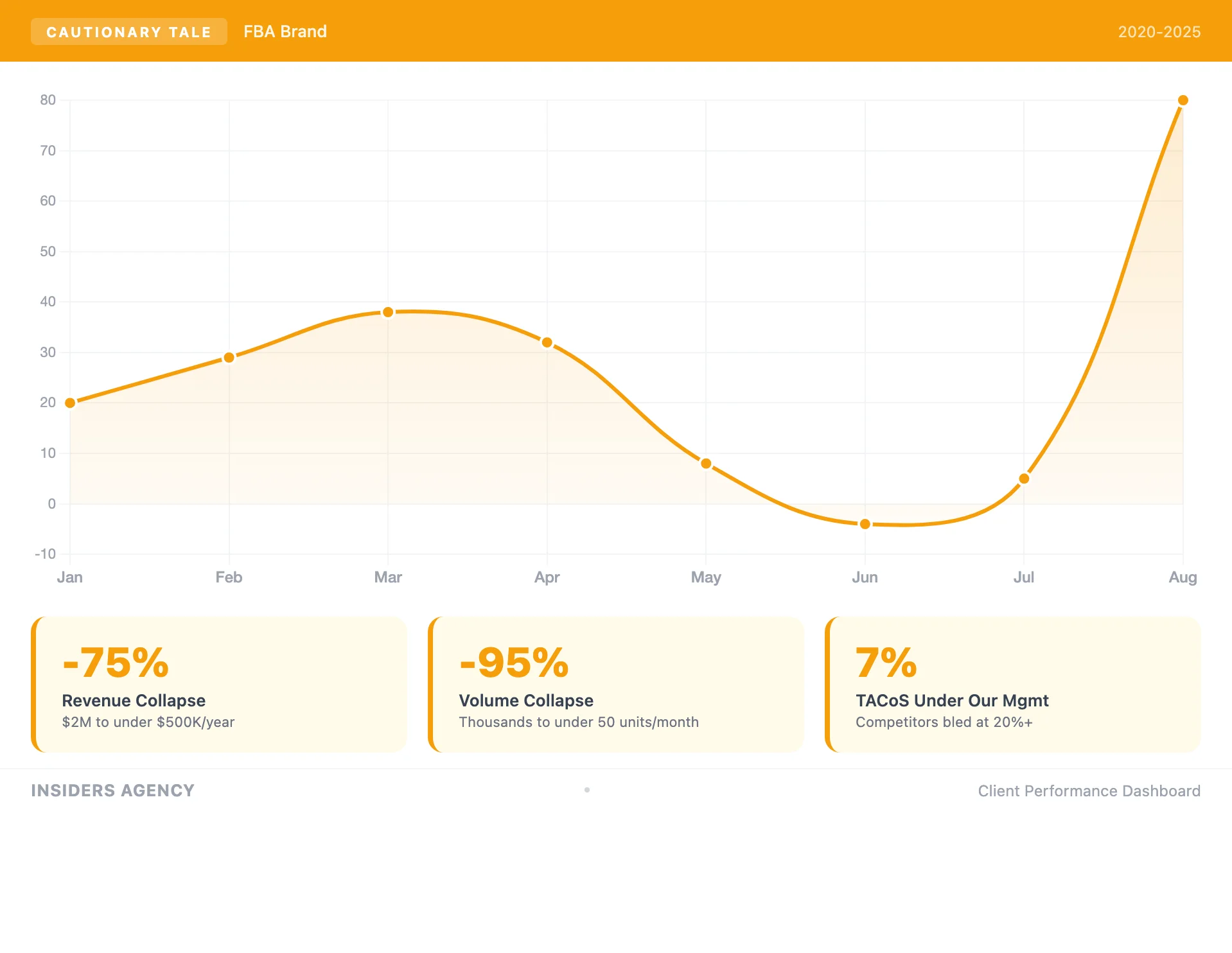 Over 3 years, we built an extraordinary 7-figure brand with 7% TACoS while competitors bled at 20%+. New owners with an 8-figure portfolio fired the experienced team, cut spend to near-zero, ignored fundamentals. In 2 years, the brand collapsed from category leader to near closure.