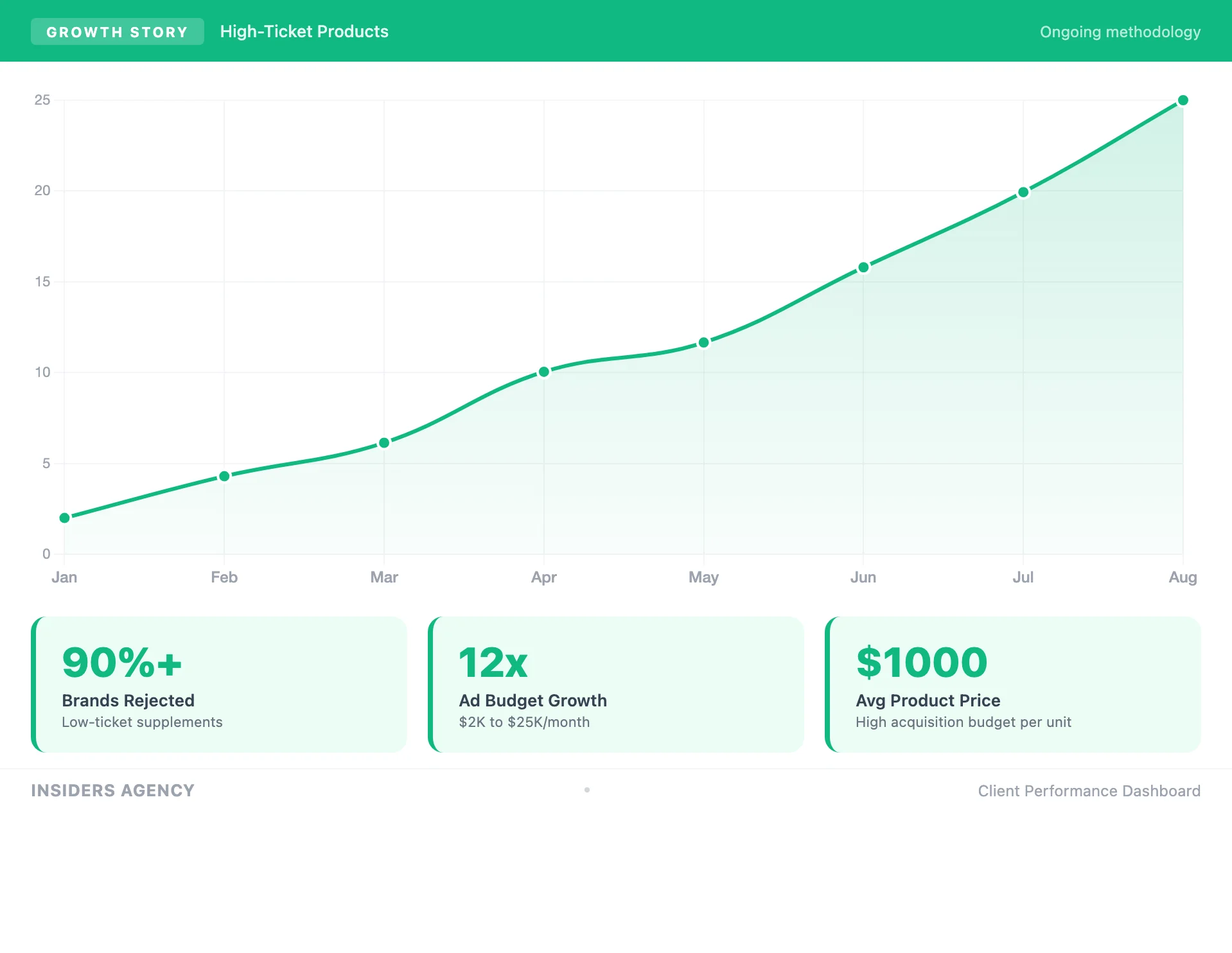 Continuing to build 8-figure brands in quarters with high-ticket products. The formula is proven: ad budgets scaling from $2K to $25K/month in a single quarter, with every dollar expressing the full capability of an experienced ad team.