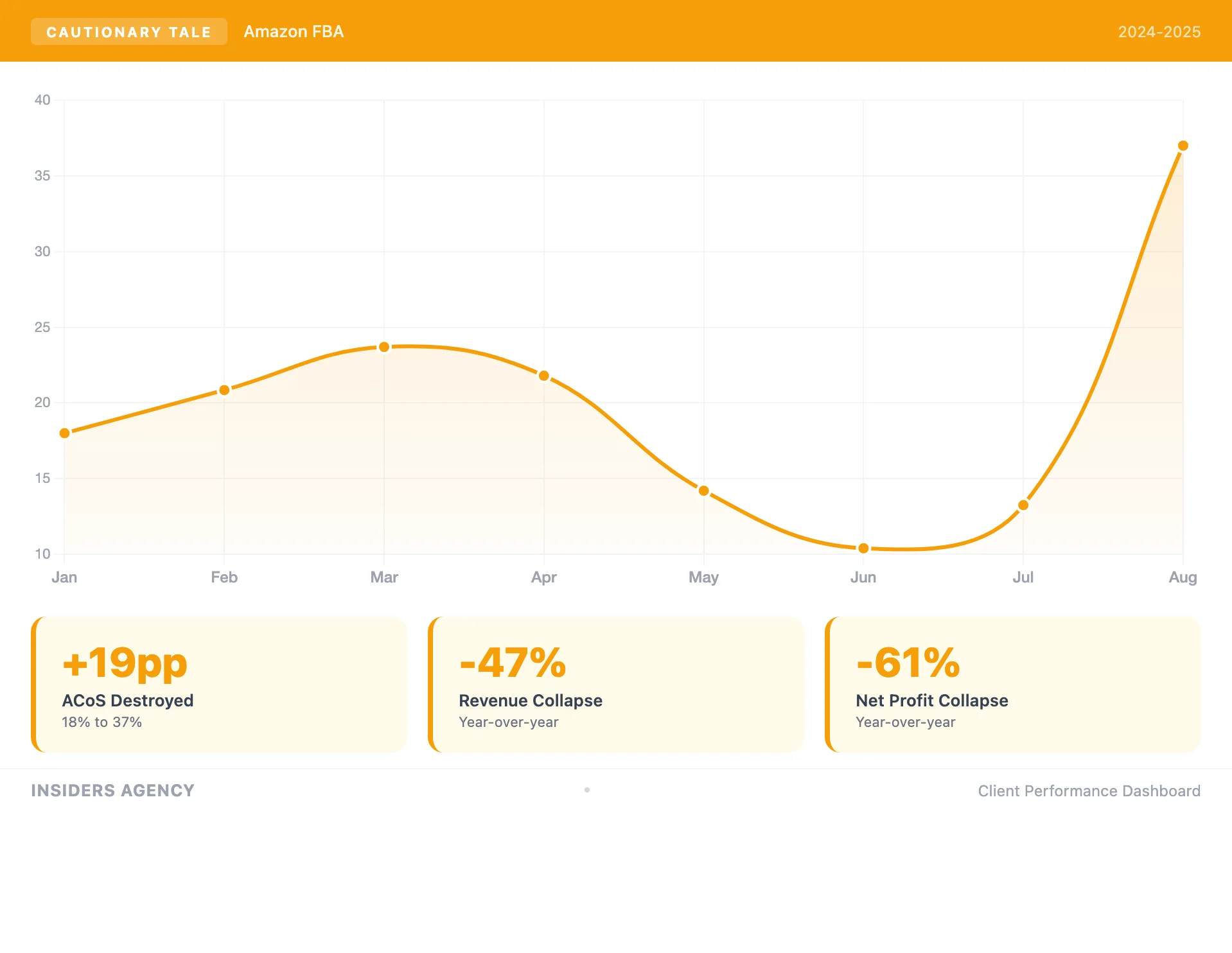 One of two clients that chose to part ways at the beginning of last year. They went in-house with their Amazon Ads. Trailing 12 months: ACoS up from 18% to 37%, revenue down 47%, net profit down 61%.