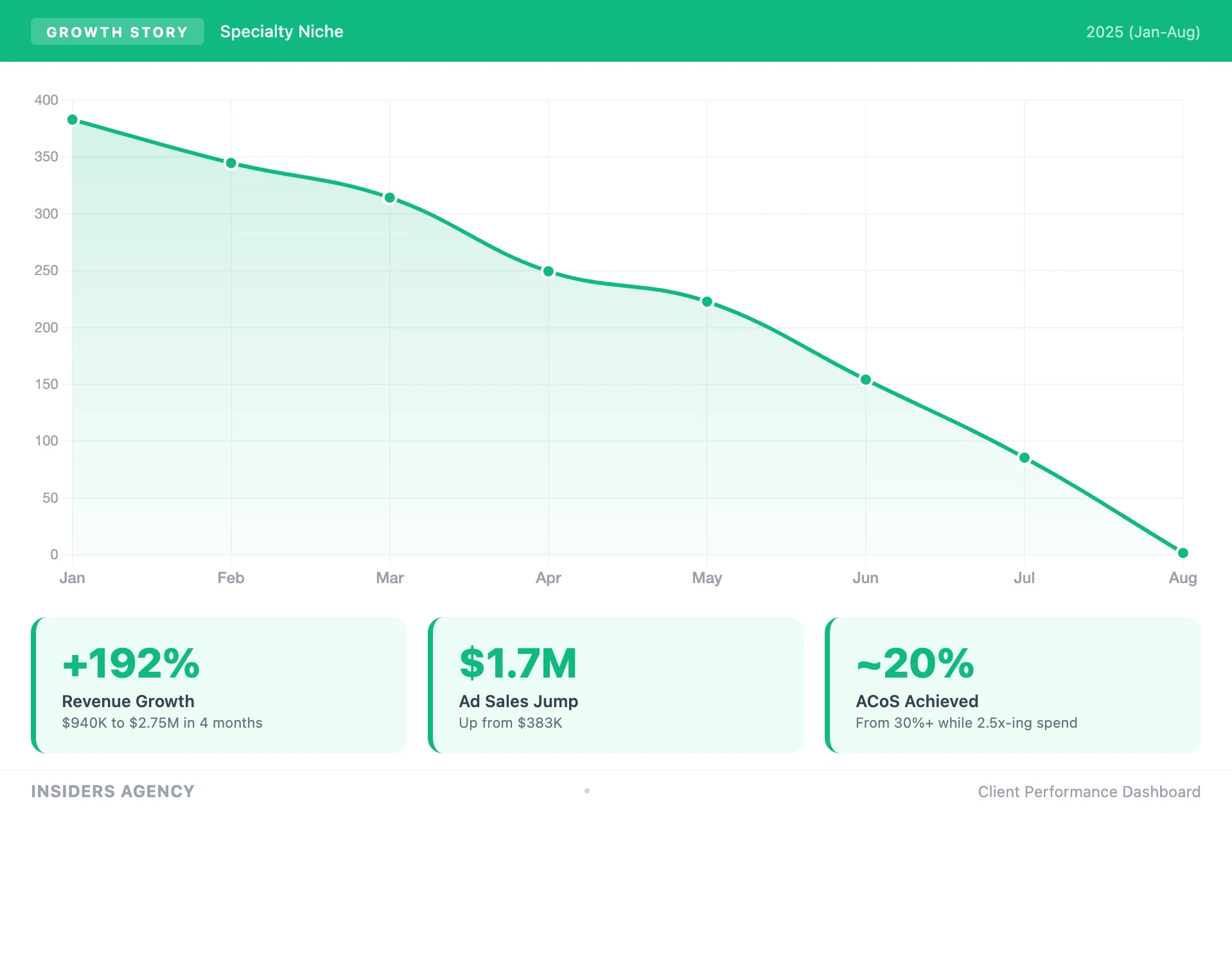 Jan-Apr: $940K. May-Aug: $2.75M. +192% growth in 4 months. Ad sales jumped from $383K to $1.7M. ACoS improved from 30%+ to ~20% while 2.5x-ing ad spend. Bold prediction: will be first 8-figure player in this niche.
